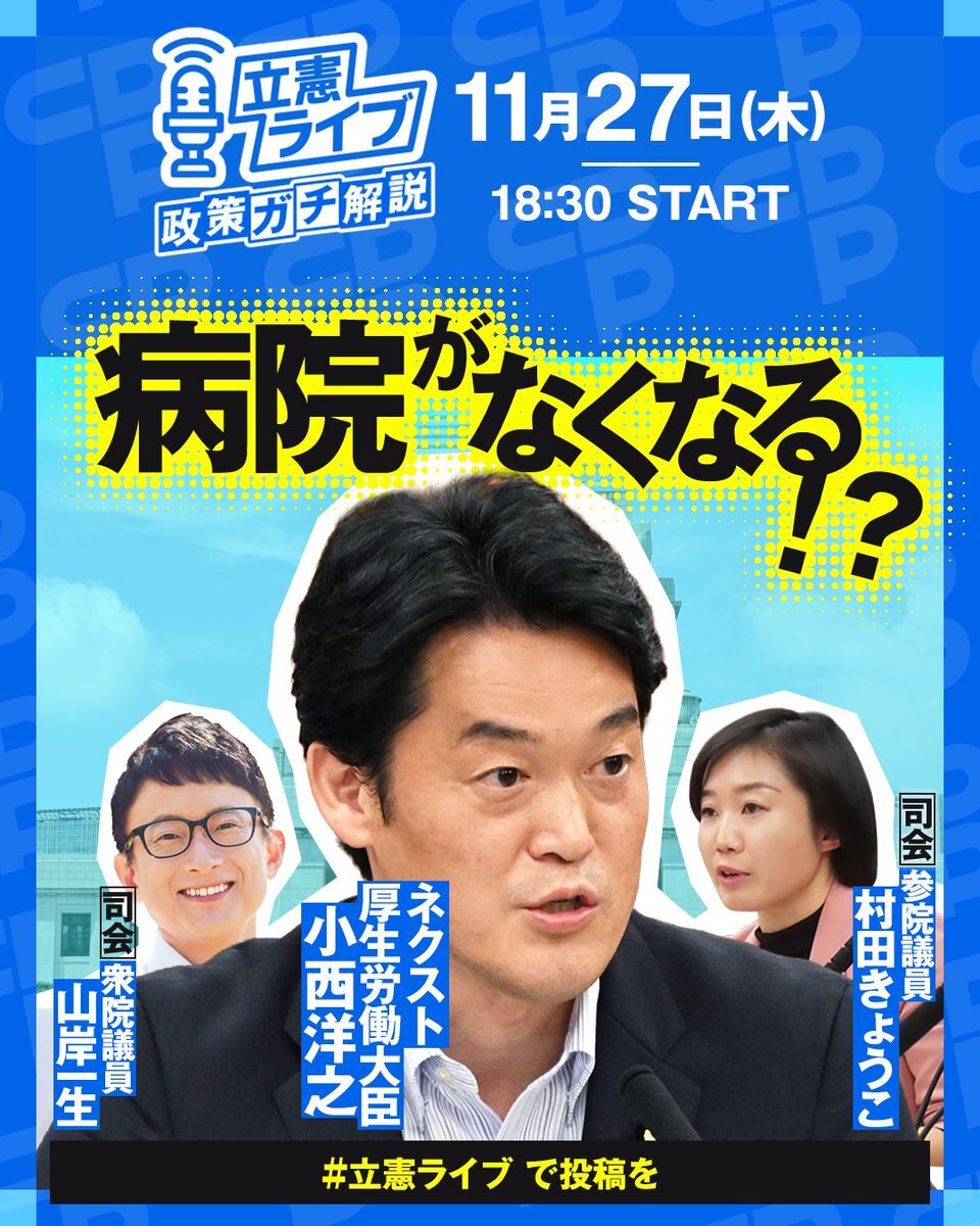 📢立憲ライブ―政策ガチ解説― 「病院がなくなる!?」 🗓️11月27日(木)18:30~19:00 🔗 youtube.com/live/yIydr8n4n… 🗣️スピーカー:小西洋之 ネクスト厚生労働大臣(@konishihiroyuki) 🗣️司会:村田きょうこ 参院議員(@murata_kyonkyon)、山岸一生 衆院議員(@isseiyamagishi) 💬#立憲ライブ
