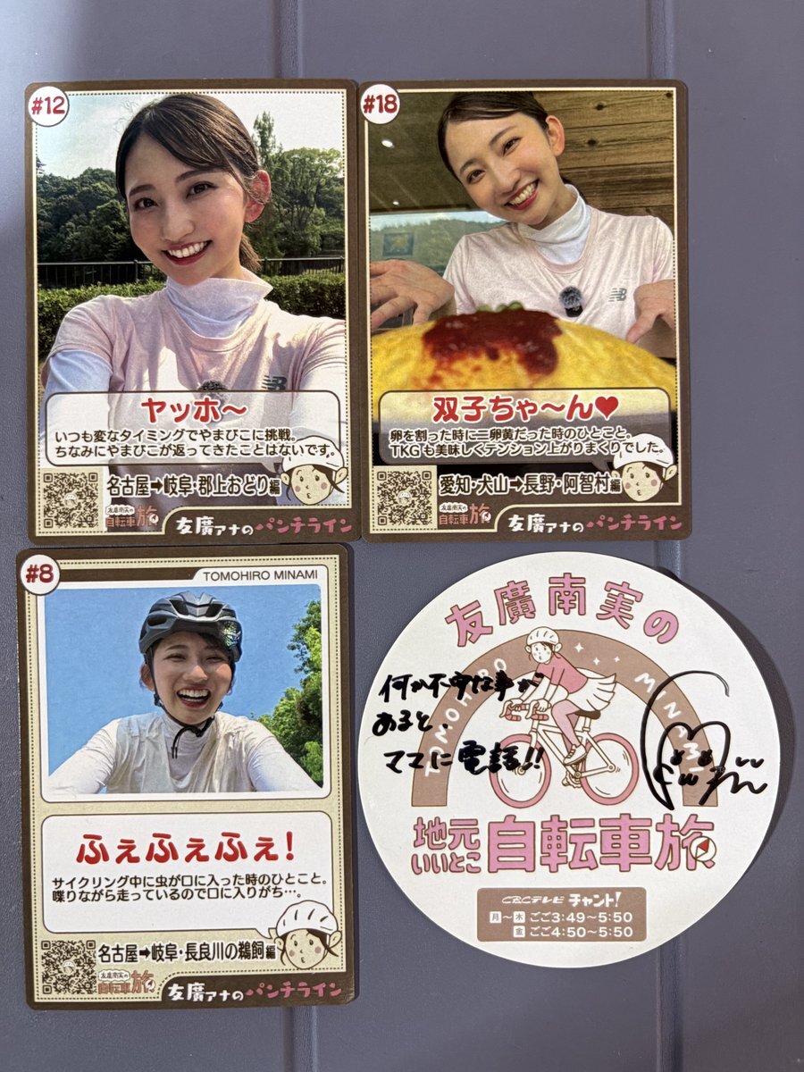 12月20日 友廣南実 自転車旅 はじめてのイベントに参加したよ 朝早く出かけて買えたグッズ達 頑張って早起きして良かったよ パンチラインカードも、会場に居た人達のお陰で25種コンプ出来たし。 #友廣南実 #CBCテレビ #自転車旅 pic.x.com/dhHx7yOXzo