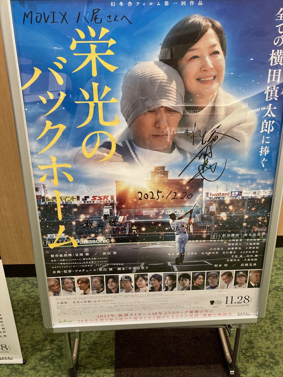 一回家帰ろうとしてから、ふと栄光のバックホームのノボリ撮ろうと思い立って、映画館戻った そしたら、床立てポスター?になんと松谷さんのサインが…! 興奮してたら、俺の横のおじさんも興奮してたので、ちょっと立ち話 良い方でした、一期一会😌 #栄光のバックホーム #舞台挨拶 pic.x.com/QD7cUoGpOn