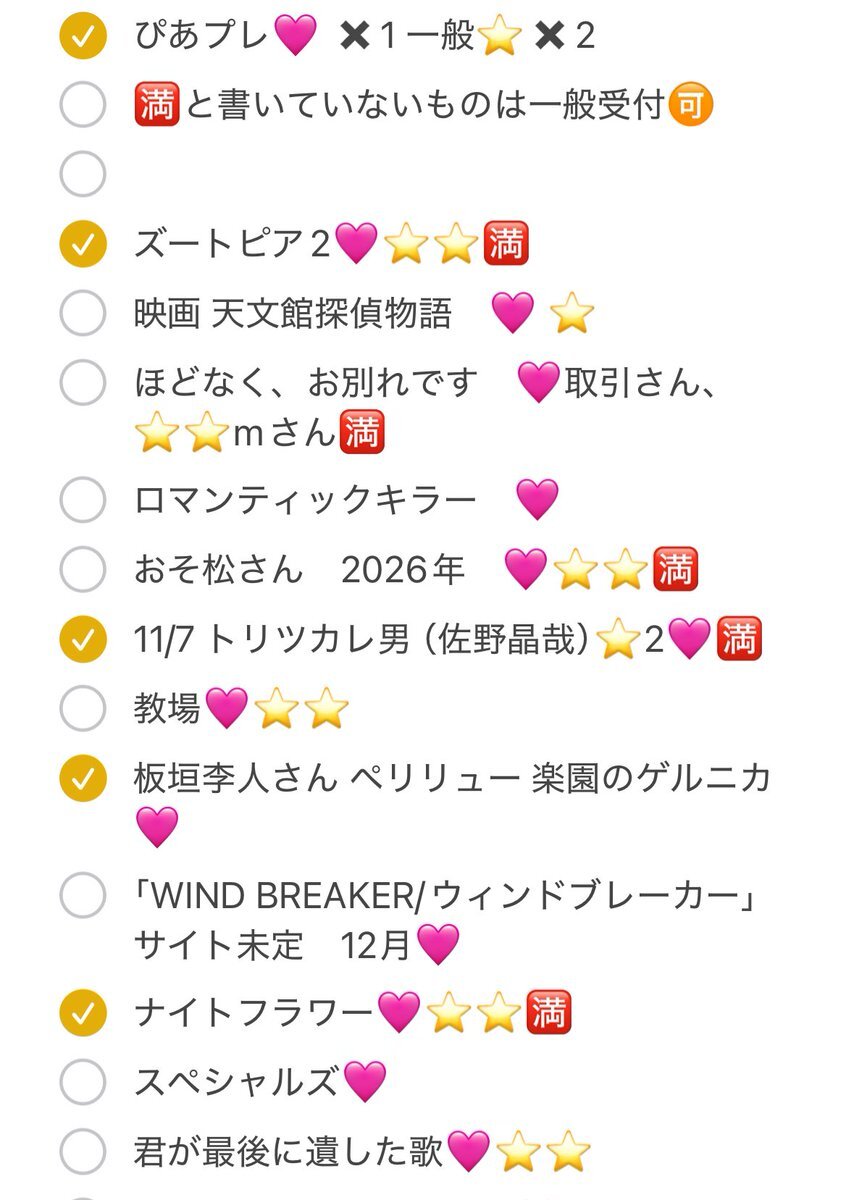 以下お約束済みです 申し込み済みは載せておりませんが、舞台挨拶がある限り申し込みは致します🙇‍♀️ 🩷ぴあプレ ⭐️一般です #チケット協力 #舞台挨拶協力 #舞台挨拶 pic.x.com/WYG76KrG9A
