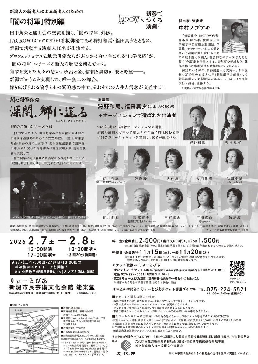 【出演情報🎭️】 本日よりチケット一般販売開始です! チラシもかなり素敵なデザイン🎨 #JACROW 闇の将軍外伝 『深闇、郷に還る』 2026年2月7日(土)13:00/17:00 開演 2月8日(日)13:00 開演 りゅーとぴあ能楽堂 #闇の将軍外伝 #田中角栄 #演劇 #舞台 詳細は下記まで🦁 ryutopia.or.jp/performance/ev… pic.x.com/9haiVAFEg7