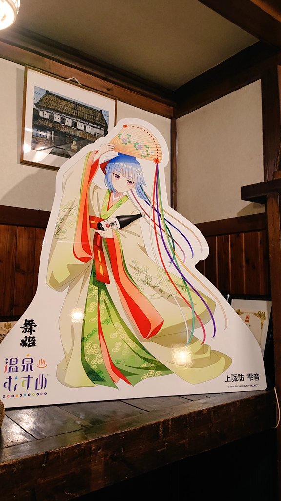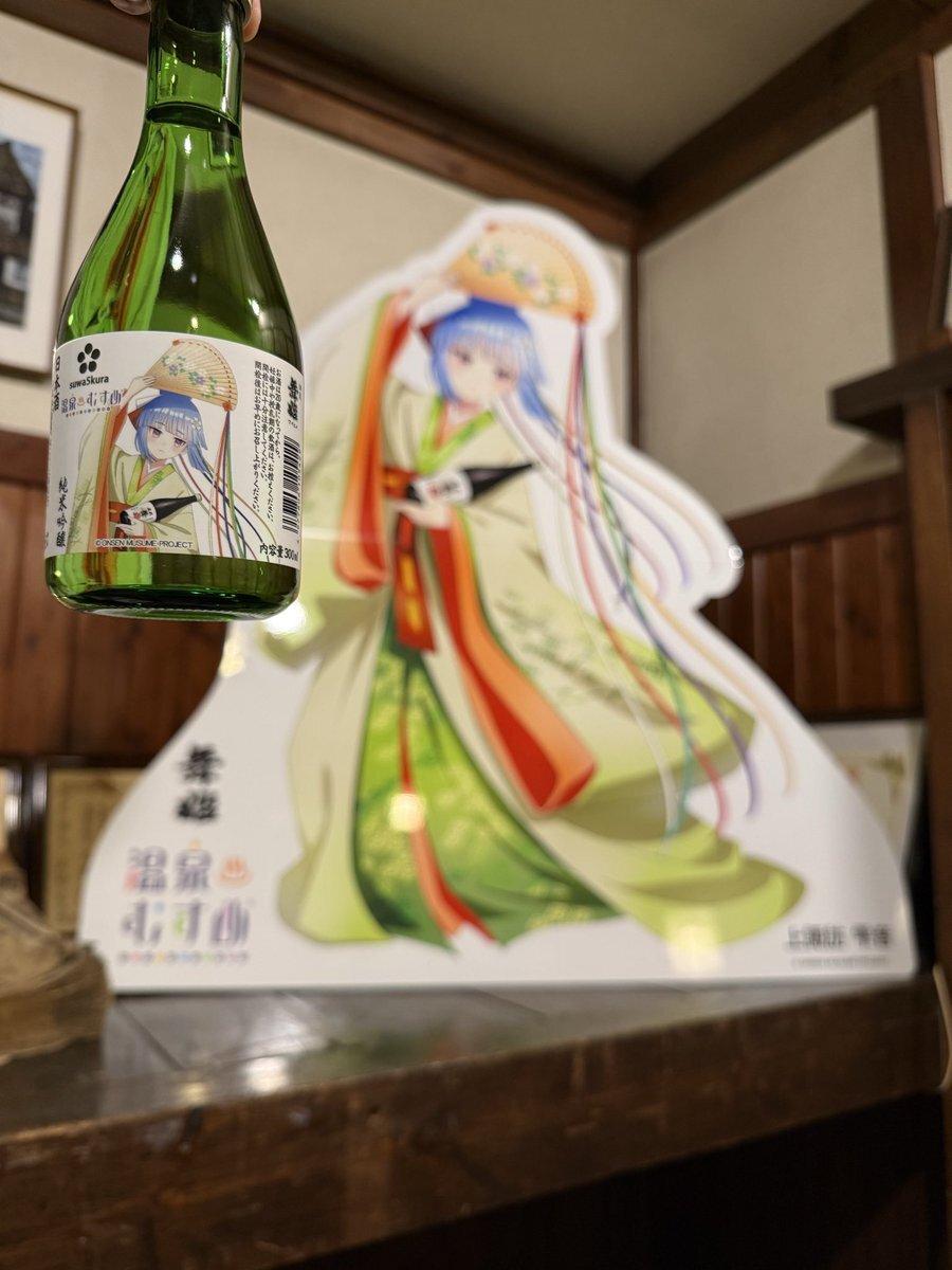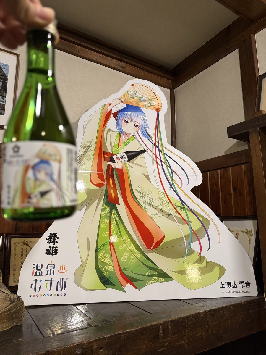 諏訪五蔵の1つ、舞姫の『株式会社舞姫』さんへ こちらは鮮やかな着物で舞をしつつ表情には憂いを感じる、そんな大人っぽさ溢れる雫音さんです🥰 POPも一番大きく迫力があります どこの蔵も丁寧に対応していただきましたが、舞姫さんと本金酒造さんは特に明るく親切な接客で大変良かったです👍️ #舞姫 pic.x.com/qYjizqakKR