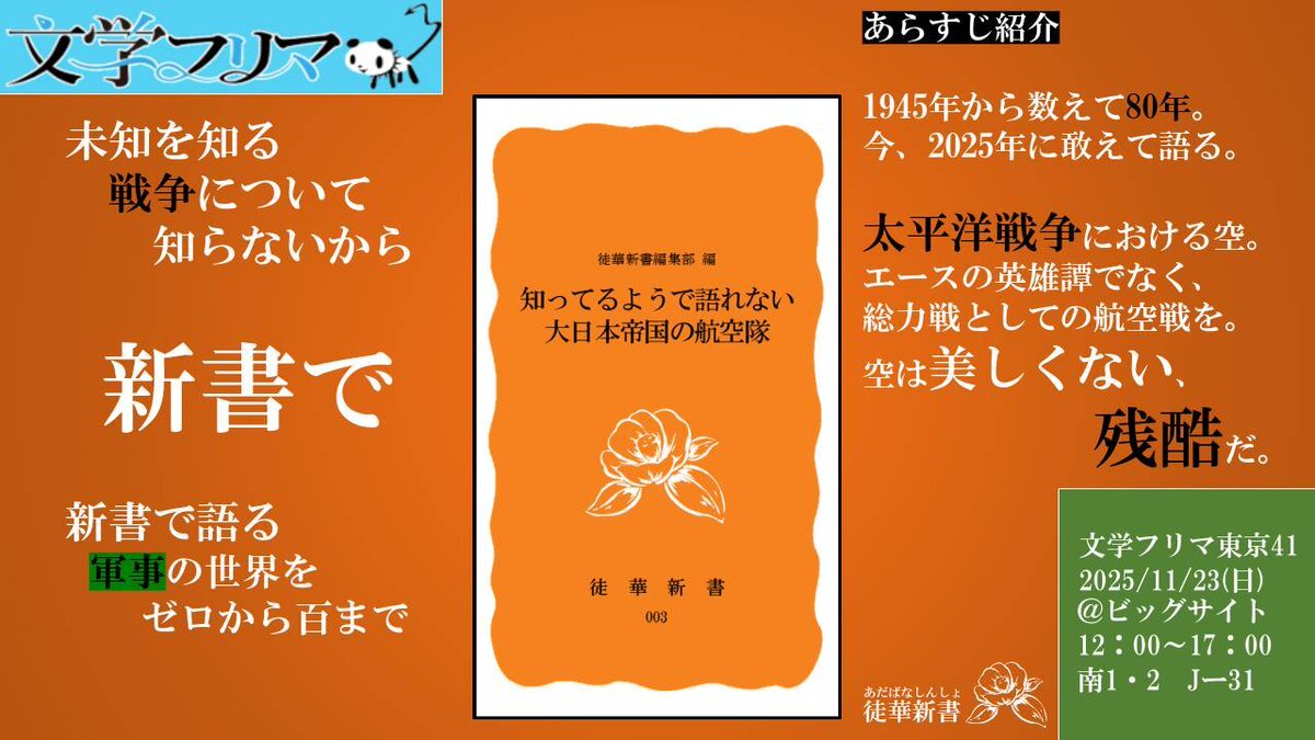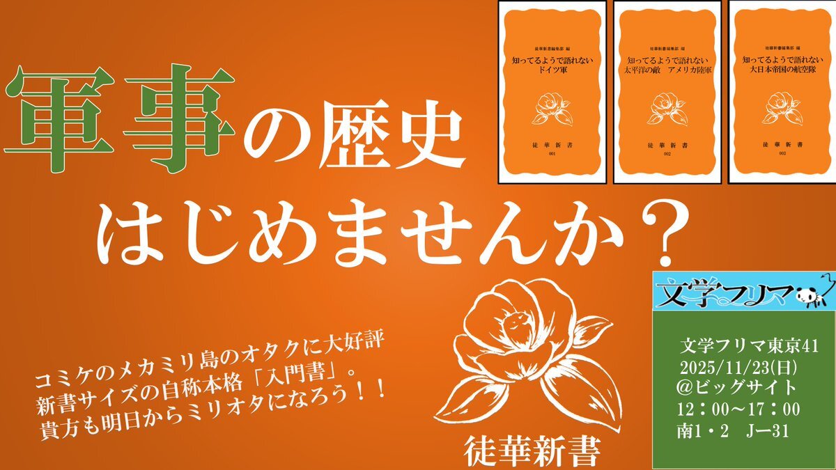 『文学フリマ東京41』参加します。 11月23日(日)にビッグサイトで僕と握手!! 日本では「新書」がある。 ミリタリーという小難しそうなことをゼロから書いた200ページの入門の新書。それが徒華新書。 ナチスドイツ、アメリカ陸軍、日本の航空隊。 この3つのテーマの同人誌。 #文学フリマ