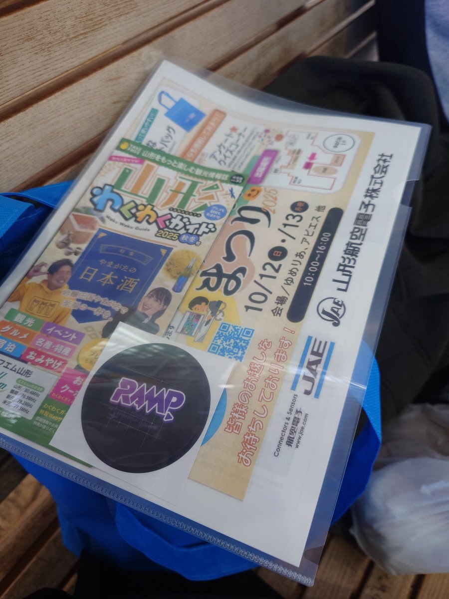 航空電子(JAE)さんが「荷物入れるのに使って下さい!」と無料で下さった袋が満杯な上、ファイルまで入っていたのでRAMPステッカーもわくわくガイドも綺麗に持って帰れる…😭 大感謝です🙇💦💦 #もがみ大産業まつり #RAMP804 #航空電子 pic.x.com/MFnd96unl5