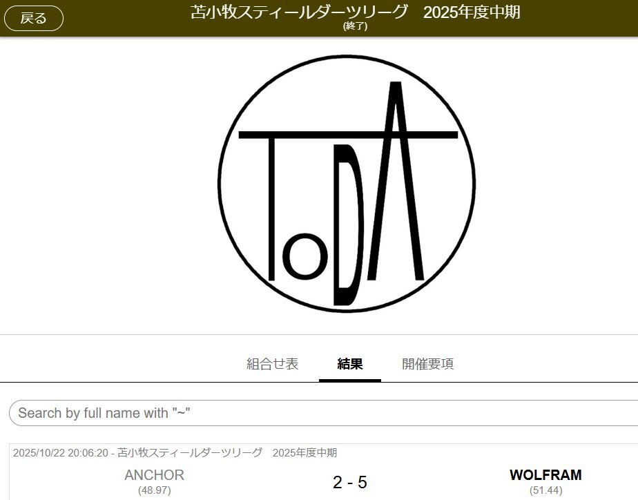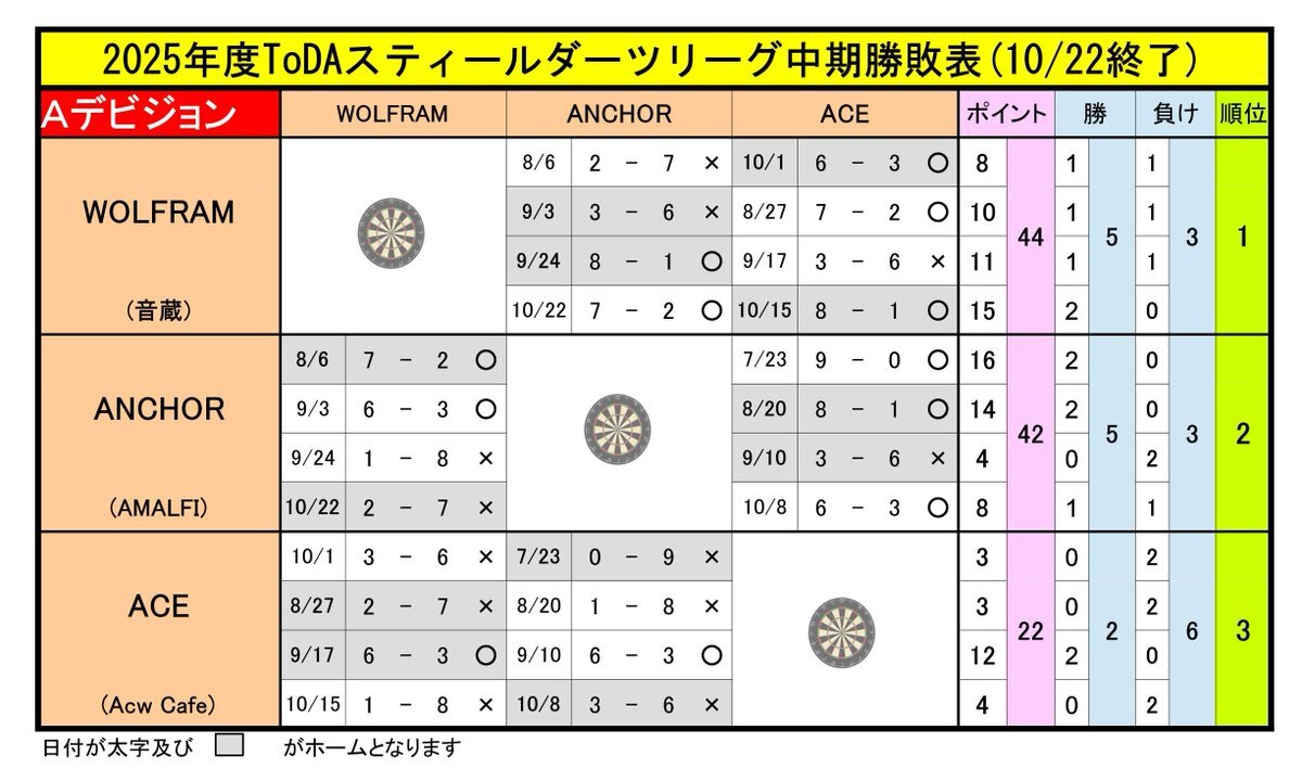 2025年度中期リーグ第12節結果 2025年10月22日(水) ANCHOR 2-7 WOLFRAM 順位 1位 44P WOLFRAM 5勝3敗 2位 42P ANCHOR 5勝3敗 3位 22P ACE 2勝6敗 昨日のスコアはこちらで見られます。 n01darts.com/n01/league/n01… facebook.com/permalink.php?… #ダーツ #スティールダーツ #苫小牧 pic.x.com/kjoVKhTQDD