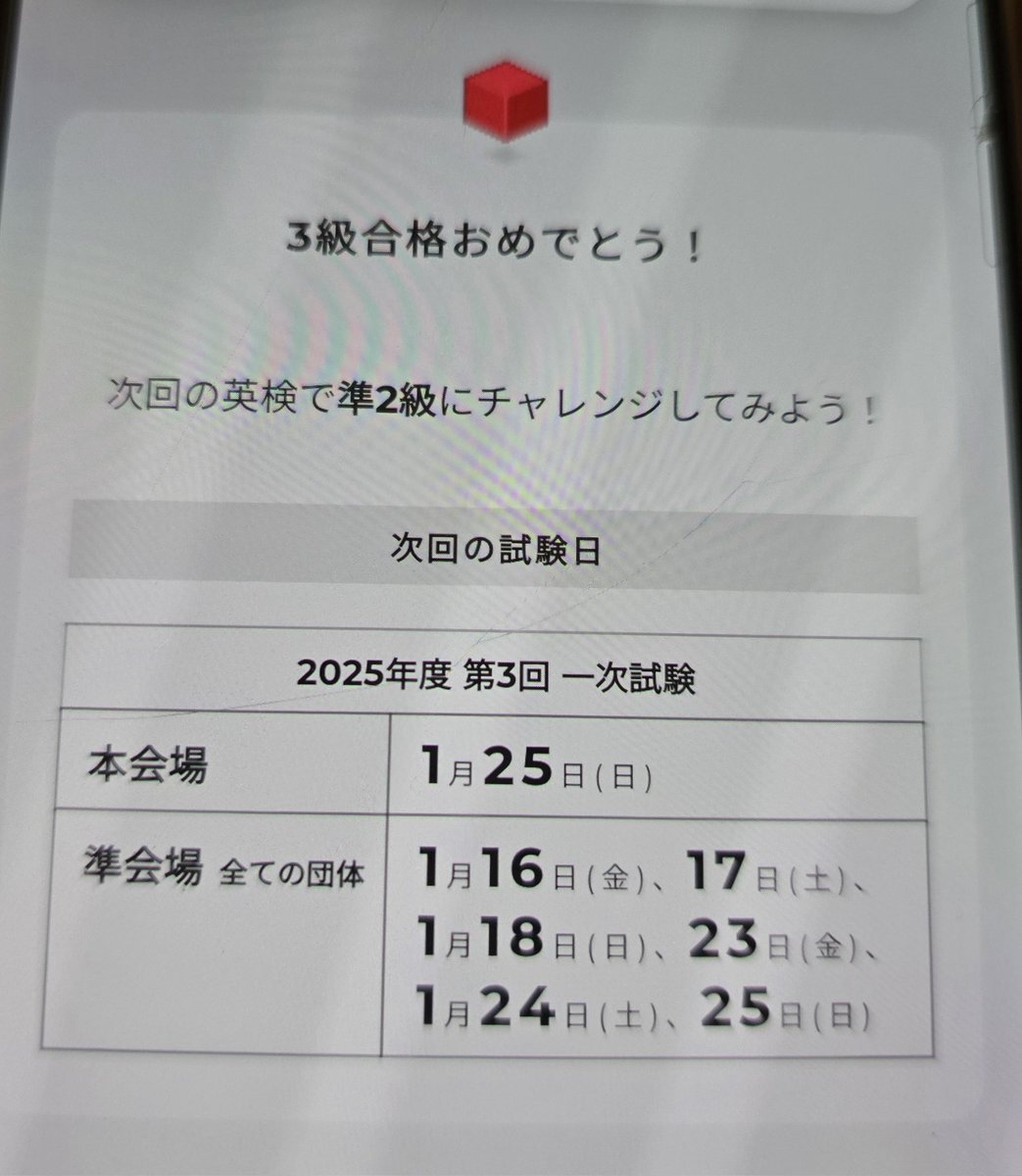 とりあえず長男も英検3級二次試験 受かったようで安心しました 来年は高校で強制的に受けさせられるから準2級 次男は4級に挑戦です 🥣怖くてまだやってない と言うか部屋片付けに必死 #英検 pic.x.com/DZDuvLoe9k