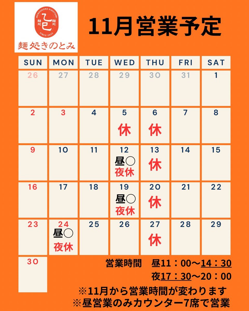 平素よりお引き立ていただき ありがとうございます。 【11月からの変更点のお知らせ】 ・昼営業はカウンター席のみで営業 ・営業時間昼は11時から14時30分 ・夜は17時30分から20時 何卒よろしくお願いします🙇‍♂️