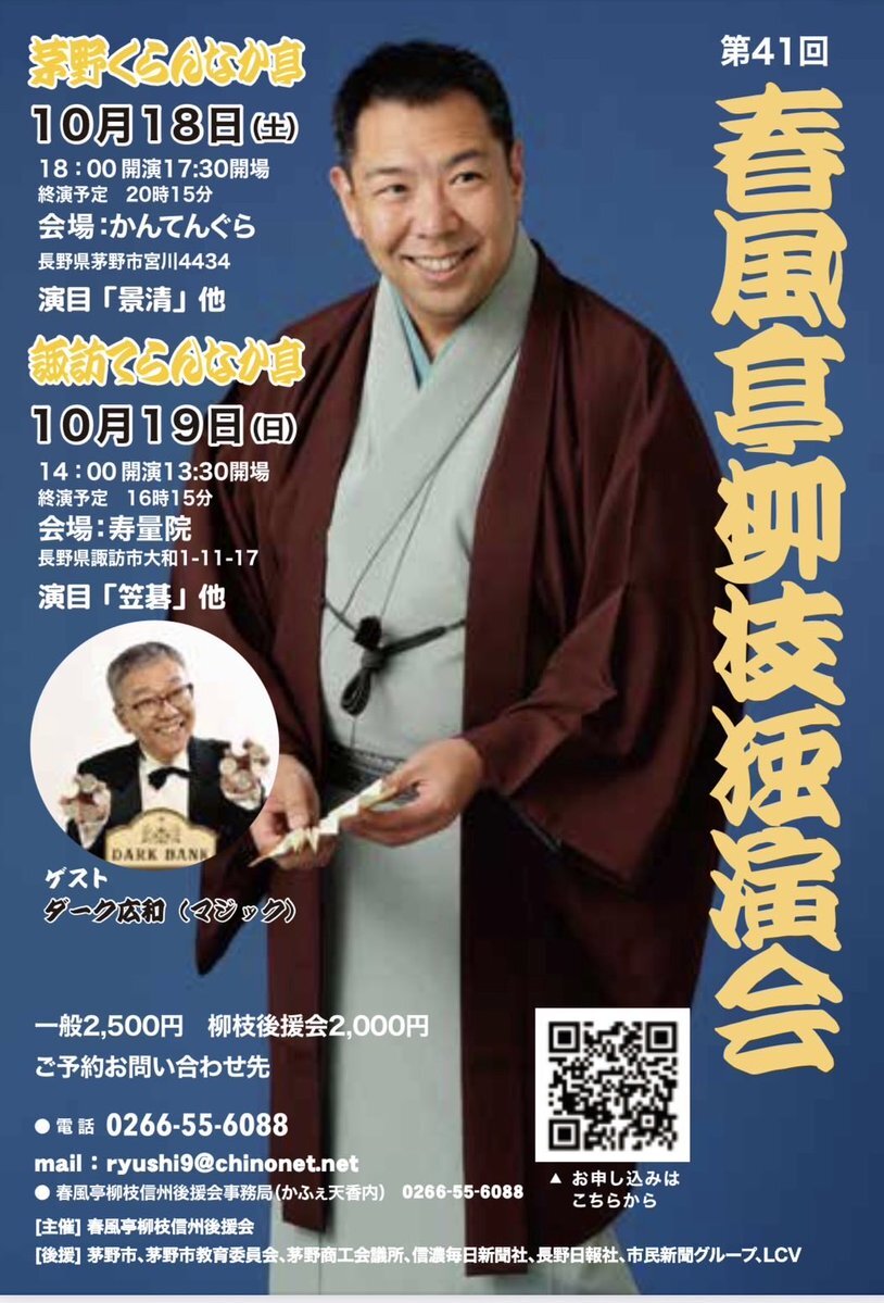 第41回目の私の信州独演会。諏訪地域の皆様、あと10日です。よろしくお願い申し上げます。今回はダーク広和先生がゲストです。一生懸命申し上げます。なにとぞ! #茅野 #諏訪 #落語 #信州 #春風亭柳枝 x.com/ryushi9_jimu/s…