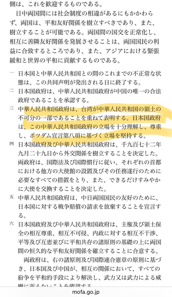 日本は台湾を中国の一部と認めていません。中国が台湾に武力侵攻しない限り、領土については曖昧にしますが、武力侵攻があればその限りでないことは1972年に大平外相が明確に答弁しています x.com/pheasant_mt/st…