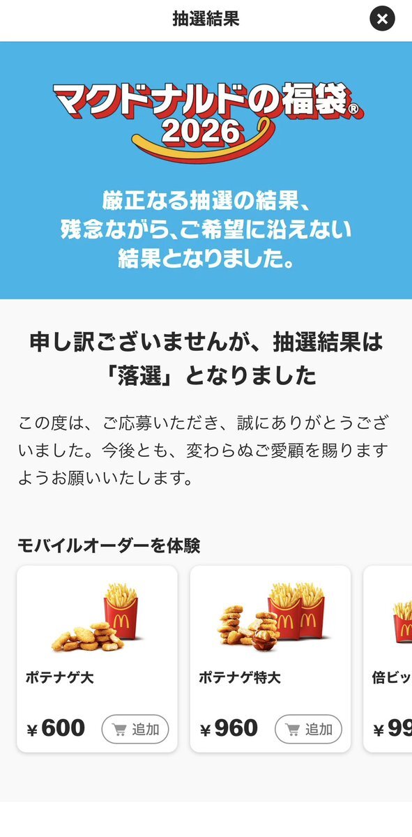 返信先:@McDonaldsJapan他2人#マクドナルドの福袋2026 無事 #落選。 また来年。 mcdonalds.co.jp/campaign/lb-20… pic.x.com/6DQAOzuwcz x.com/mcdonaldsjapan…