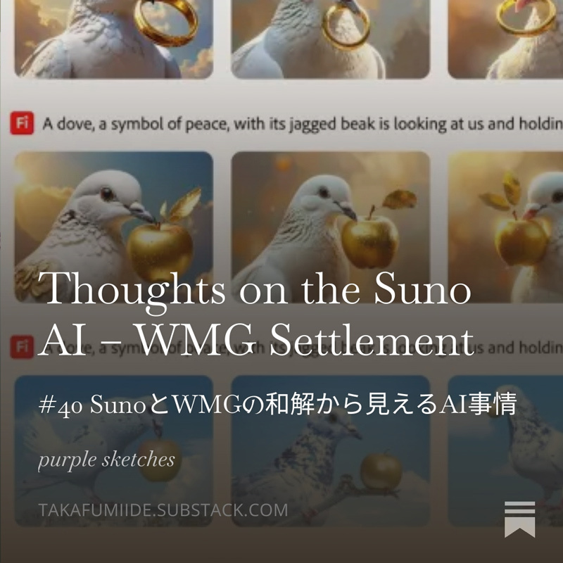 🟪🎨purple sketches🎨🟪 最近、Suno AIとWarner Music Groupの和解&提携ニュースを見て、AI音楽生成と著作権の未来について考えてみました。人間の創作とAIの学習の違い、業界の変化、そして今思うこと。よかったら読んでみてください! takafumiide.substack.com/p/thoughts-on-… #AI音楽 #SunoAI #WMG #著作権 pic.x.com/rt69UOuxCJ