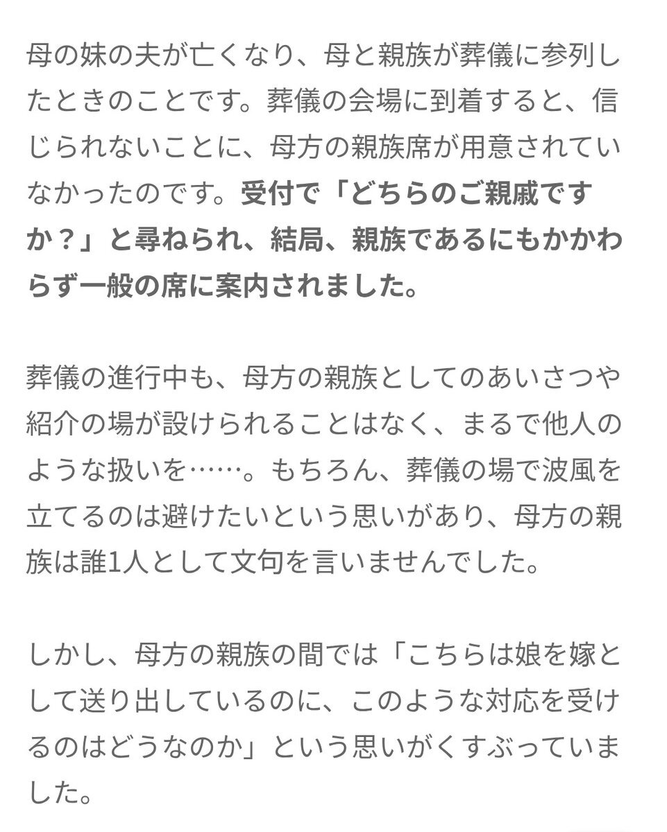 [ どちらの ご #親戚 ですか?」 え? #母方 の #葬儀 なのに #親族席 がない? まさかの一般席に ( #ベビーカレンダー より ) 親族なのに他人のような扱い woman-calendar.jp/184970/ 昔ほど厳格ではなくても 最低限のマナーや相手への 気づかいは大切にしたいものです。 pic.x.com/PVk1lhwpaT