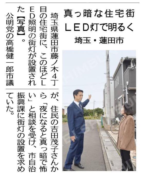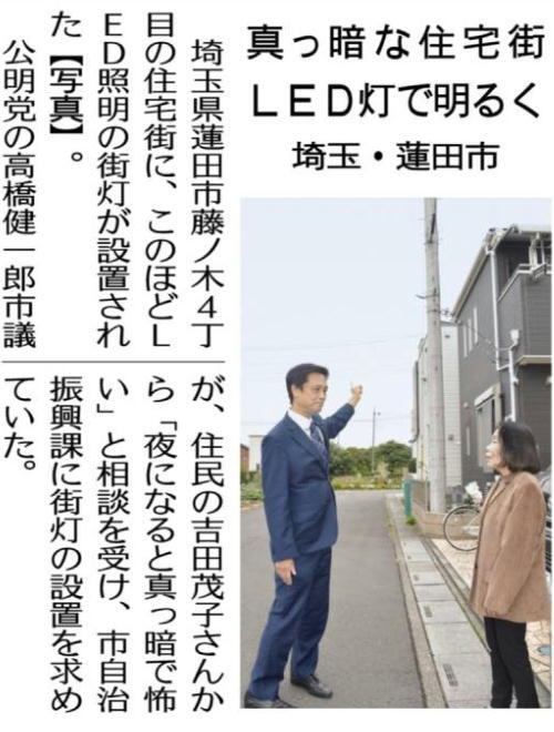 #本日の公明新聞より。今日も総支部内、同僚議員の地域での実績記事が紹介されています。今日は、#蓮田市 の #高橋健一郎 市議です。高橋議員は地域住民からの「夜になると真っ暗で怖い」との相談を受け街灯を設置しました。 #がんばろう公明党 pic.x.com/dUrKe42w3j