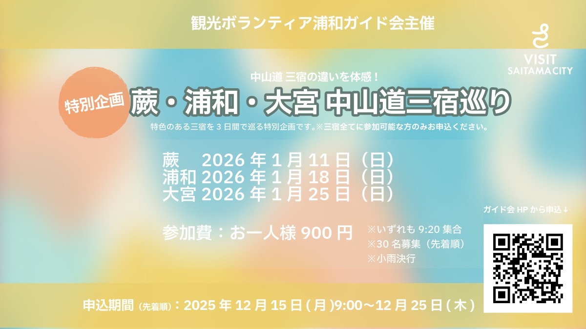 観光ボランティア浦和ガイド会主催 特別企画🎉 蕨・浦和・大宮 中山道三宿巡り  ̄ ̄ ̄ ̄ ̄ ̄ ̄ 🗓️蕨 2026年1月11日(日) 🗓️浦和 2026年1月18日(日) 🗓️大宮 2026年1月25日(日) ※小雨決行 全ての日程に参加可能な方のみお申込ください。 詳細🔗visitsaitamacity.jp/news/191 #さいたま市 #蕨市 #中山道 pic.x.com/e7Ga3wTQQn