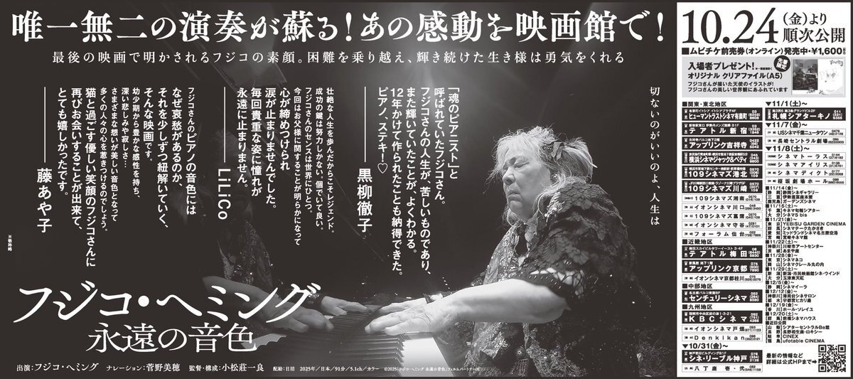 本日、朝日新聞の朝刊(関東版)に 『フジコ・ヘミング 永遠の音色』の広告が掲載されました! 今後全国版もお目にかかるかと。 #黒柳徹子 さん、#LiLiCo さん、#藤あや子 さん、#クリス智子 さん 愛あふれるメッセージありがとうございます。 10月24日(金)から #ヒューマントラストシネマ有楽町 pic.x.com/Y8GK40RO64