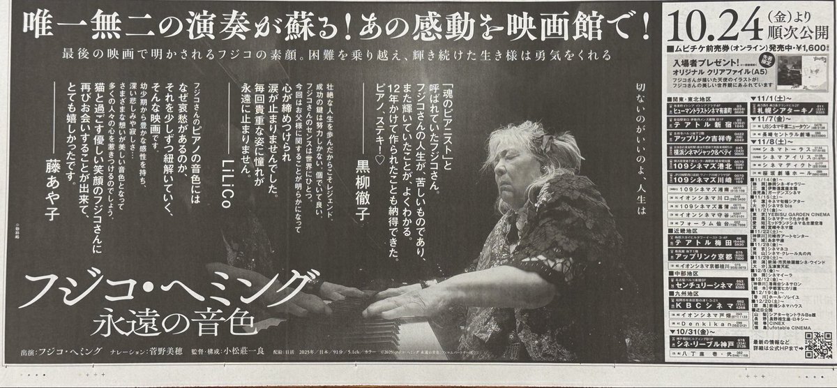 本日、朝日新聞の朝刊(全国版、関東版)に 『フジコ・ヘミング 永遠の音色』の広告が掲載されました! #黒柳徹子 さん、#LiLiCo さん、#藤あや子 さん、#クリス智子 さん 愛あふれるメッセージありがとうございます。 10月24日(金)から #ヒューマントラストシネマ有楽町 ほか順次全国公開です! pic.x.com/5j3RiUccV8