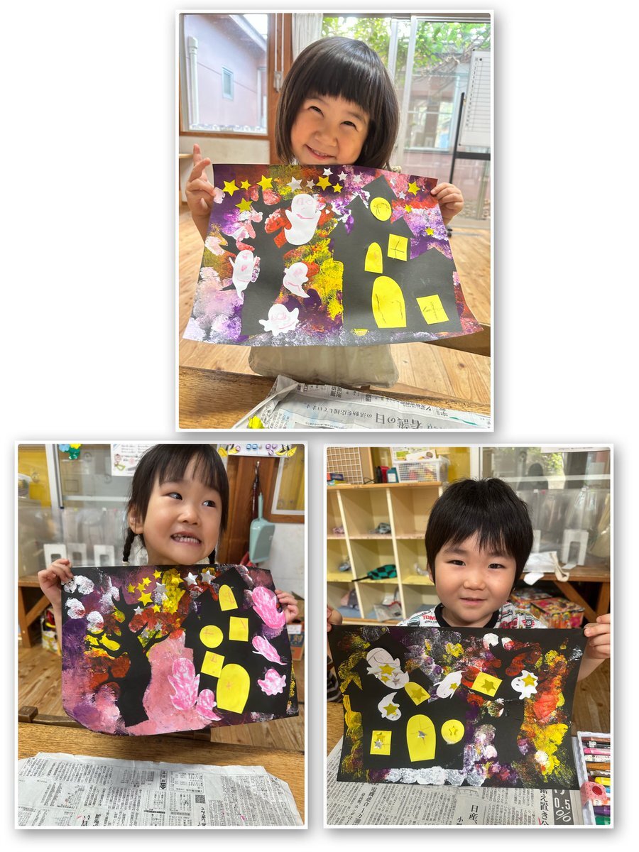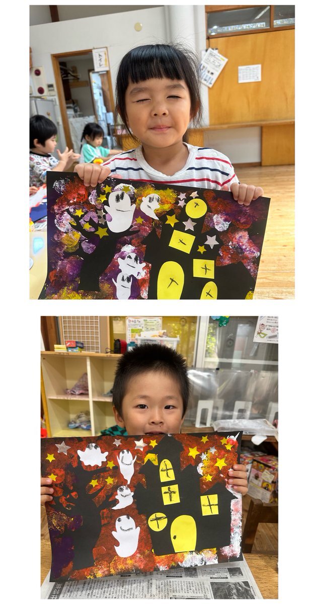 ハロウィンの製作をしました🎃 お化けに顔を描いたり、家の窓を付け模様を描きました😊 完成すると、「お化けできたー。」と喜んでいました✨ ハロウィンが楽しみだね❣️ #益子町 #七井保育園 #ハロウィン2025 #製作 #スタンプ #お化け #模様 #絵の具 #かぼちゃ #シール #年少 #嬉しい pic.x.com/VChBbdBuUH