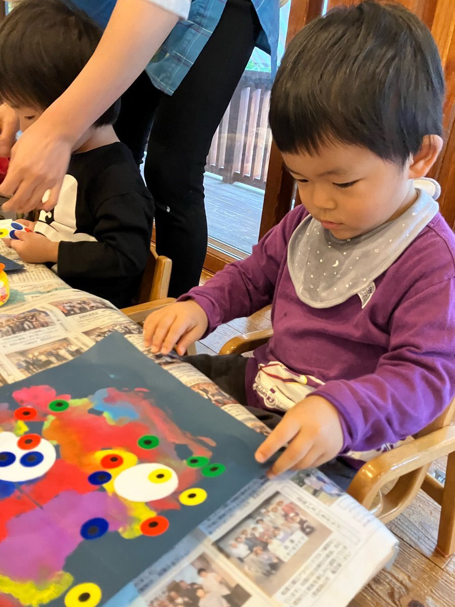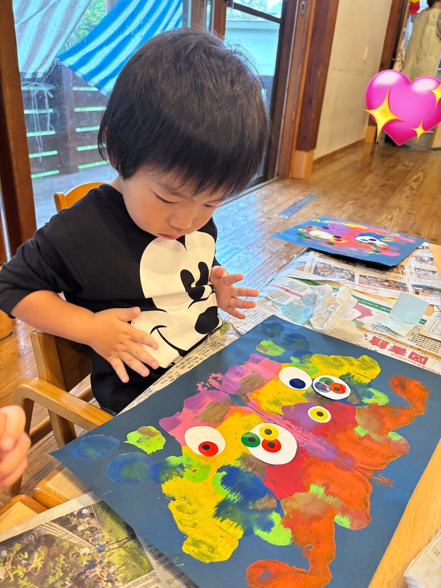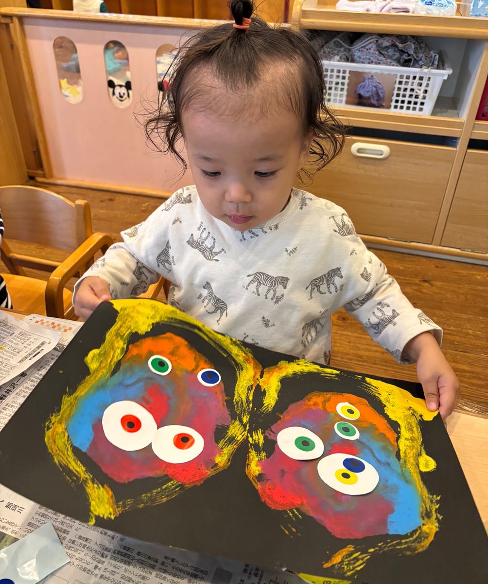 ハロウィン製作でモンスターを作りました🎃デカルコマニーで作った形に目を貼ると、個性豊かなモンスターの完成!ハロウィンの気分を味わえるように、お部屋に飾りたいと思います✨ #栃木県 #益子町 #七井保育園 #2歳児 #ハロウィン #製作 #モンスター #絵の具 #デカルコマニー #個性豊か pic.x.com/ZcobTwGfBd