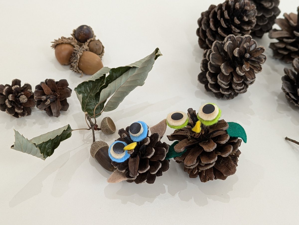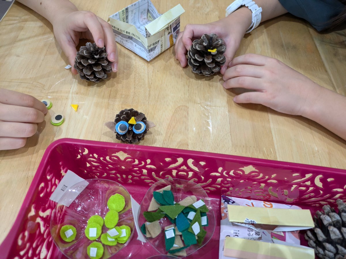 #中央子ども館 #松ぼっくり #製作 今週8日~10日のハッピータイムは松ぼっくりdeフクロウを作ろう!昨日は色とりどりのフクロウが沢山誕生しましたよ😃一人一日1個作れるので色違いでどうぞ♪🥰 pic.x.com/wlgMCXJETf