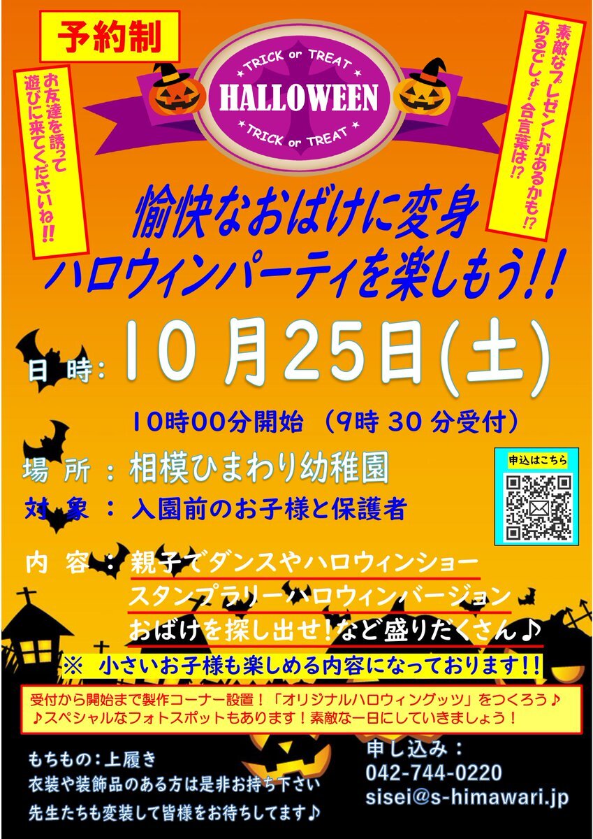10月26日(土曜日)10時開始 #未就園児対象 #ハロウィンパーティー を開催いたします。 #ダンス#製作 等、楽しい企画を考えております! みなさんと一緒に楽しい時間を過ごしていきたいと思っています♪ ご予約をお待ちしております☆ #幼稚園 #無料 #駐車場 #駐輪場 あり pic.x.com/ahhVnrDnhn