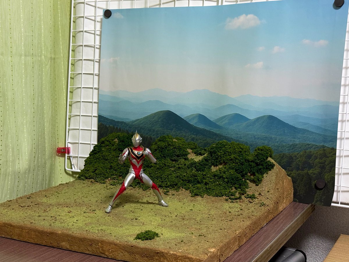 🏔情景撮影セットシリーズ 🏔 第1弾『山間』の3次受注分を準備しました。 山あいの静かな情景を再現した、 フィギュア撮影に最適なサイズ感のジオラマです。 ▼撮影例(iPhone16Pro使用) #玩基地ーガンベースー #ジオラマ #フィギュア