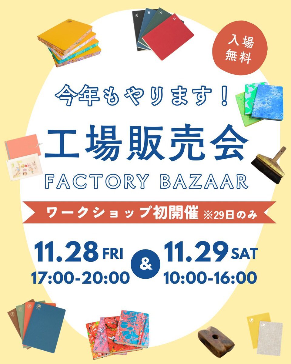 【工場販売会|11/28(金)&11/29(土)】 今年も渡邉製本で “工場販売会” を開催します! 📌28日(金) 17:00〜20:00(販売のみ) 📌29日(土) 10:00〜16:00(販売+WS) 今回は29日に“ワークショップ”を初開催! ・刷毛で仕上げるBOOK NOTE表紙くるみ ・はじめてのマーブリング体験 詳細はスレッドへ👇
