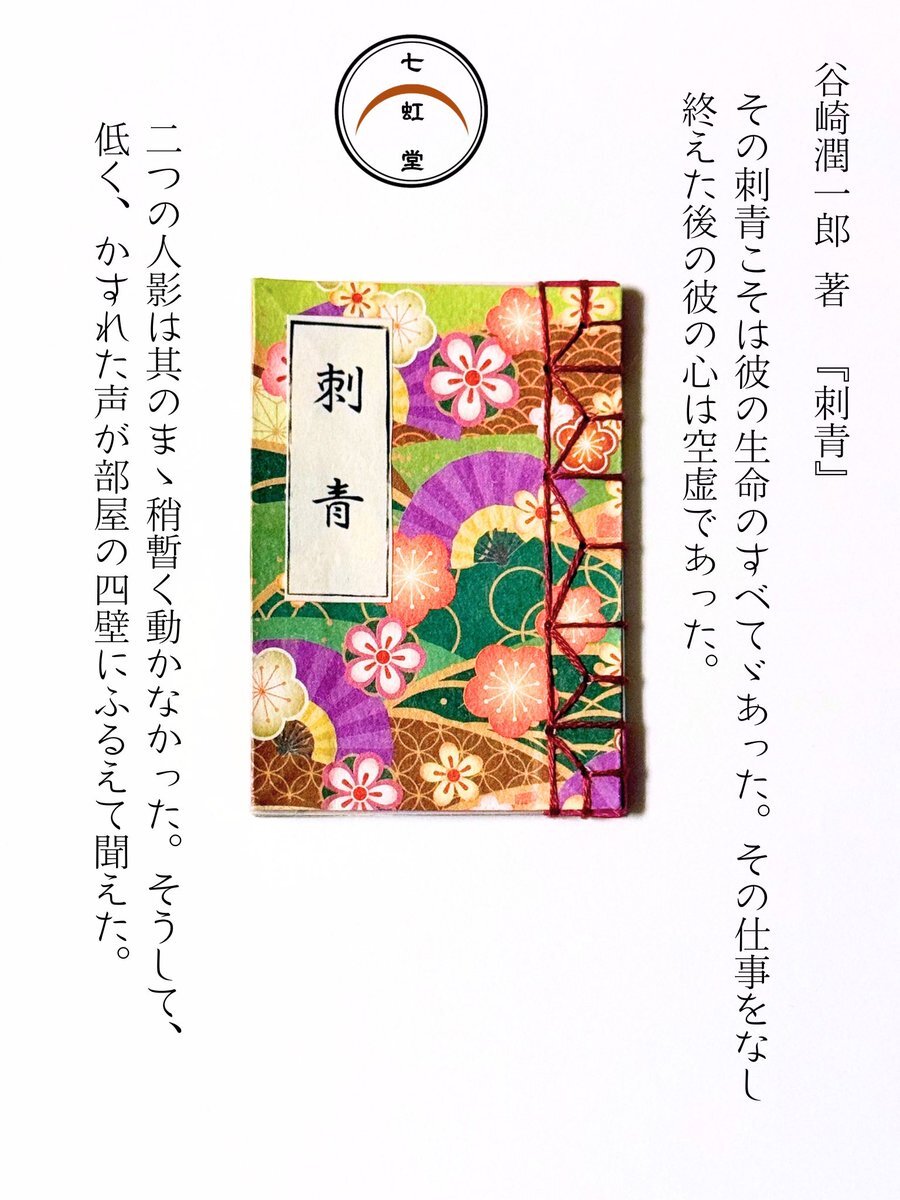 ••┈┈┈┈••販売のご案内【七 虹 堂】 【和装豆本】A8サイズ 刺青 谷崎潤一郎 著 再入荷致しました BASEにて販売しております。 shichikoudou.base.ec #和装本 #和綴じ本 #豆本 #製本 #ハンドメイド #谷崎潤一郎 pic.x.com/OkN0pwaNIa