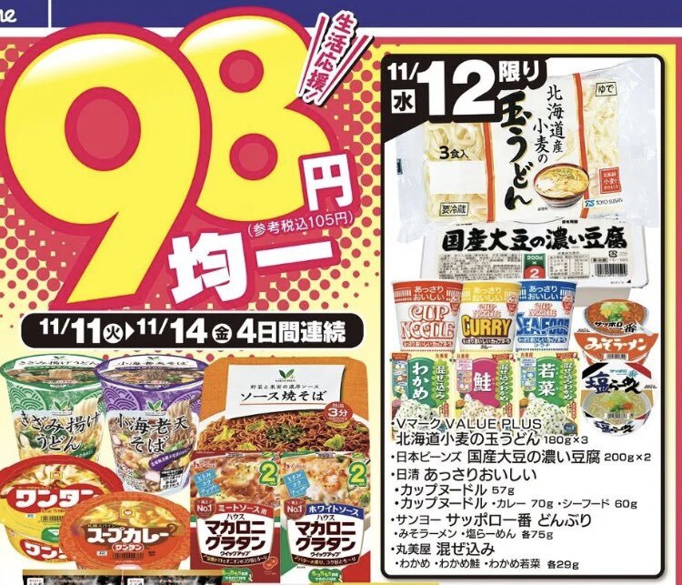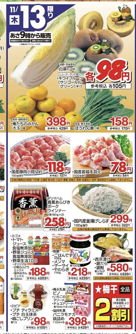 #東武ストア 西川口店より 98円均一☁️ 11/13(木)広告日替商品❤️ キウイフルーツ🥝98円 白菜🥬1/4切98円 国産豚肉小間切れ🐽100g 118円 梅干😡2割引🈹など 気温⤵️☁️体調管理⚠️ ご来店お待ちしております♪ #西川口駅 pic.x.com/uYH3SuwLbJ
