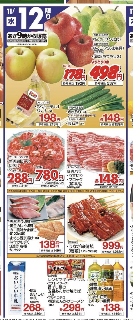 #東武ストア 西川口店より 青果の大本気市☀️ 11/12(水)広告日替商品❤️ りんご(各種)🍎🍎🍎3個498円 きゅうり🥒🥒2本148円 🇦🇺牛肉肩ロース切り落し🐂100g 288円 🇨🇳うなぎ串蒲焼(養殖)3串999円など 98円均一📣気温⤵️体調管理⚠️ ご来店お待ちしております♪ #西川口駅 pic.x.com/jEVoYJmM33
