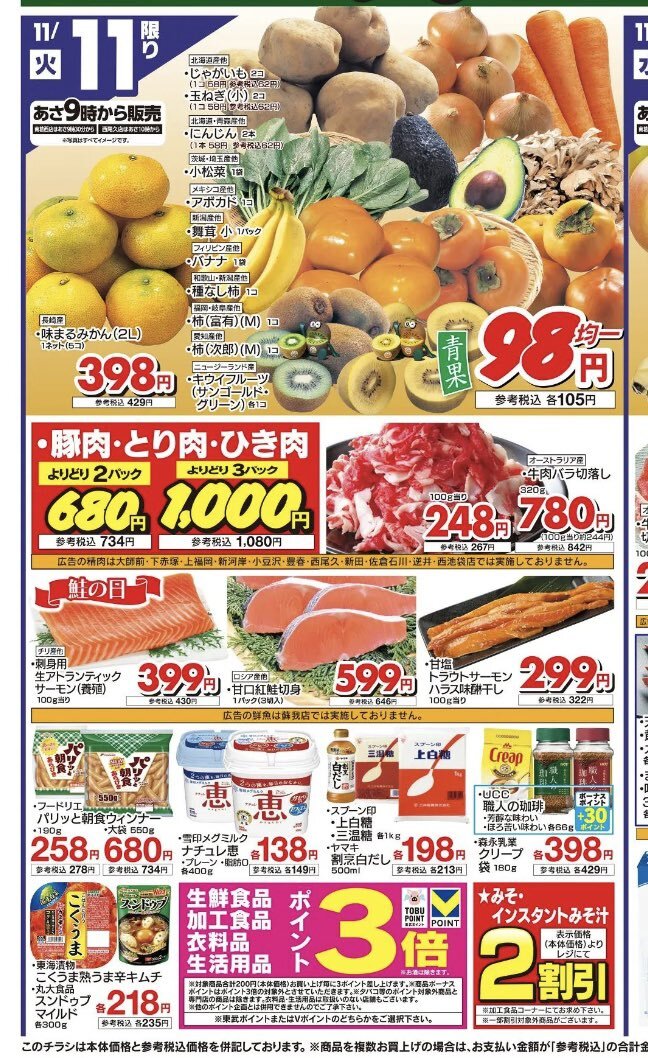 #東武ストア 西川口店より 青果の大本気市📣 11/11(火)広告日替商品❤️ 青果98円均一🍌🥝🥑🥕🥔🧅 豚肉🐽とり肉🐔ひき肉よりどり3パック1,000円 出雲あじわい牛🐂3割引🈹 🇨🇱刺身用生アトランティックサーモン(養殖)🐟100g 399円など ポイント3倍⤴️ ご来店お待ちしております♪ #西川口駅 pic.x.com/qn1tLTIyTD