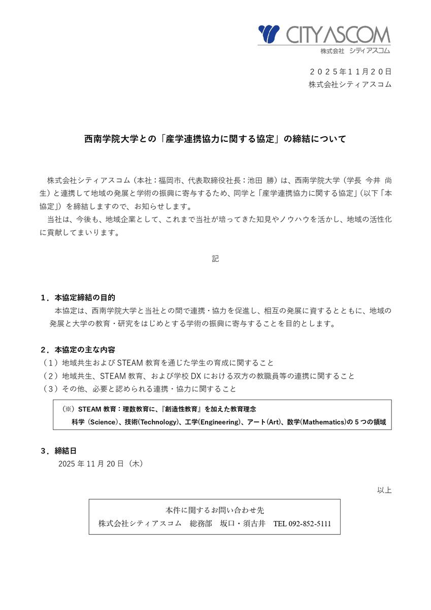 / 株式会社シティアスコムが西南学院大学と 産学連携協定を締結🤝 \ #学校DX やSTEAM教育を通じた、 科学・技術・工学・アート・数学を総合的に 学べる環境作りに取り組みます💡 地域の学生の皆さんと一緒に未来をつくる プロジェクトをスタート💡 #西日本シティ銀行 グループは、地域で頑張る pic.x.com/JwygN26vub