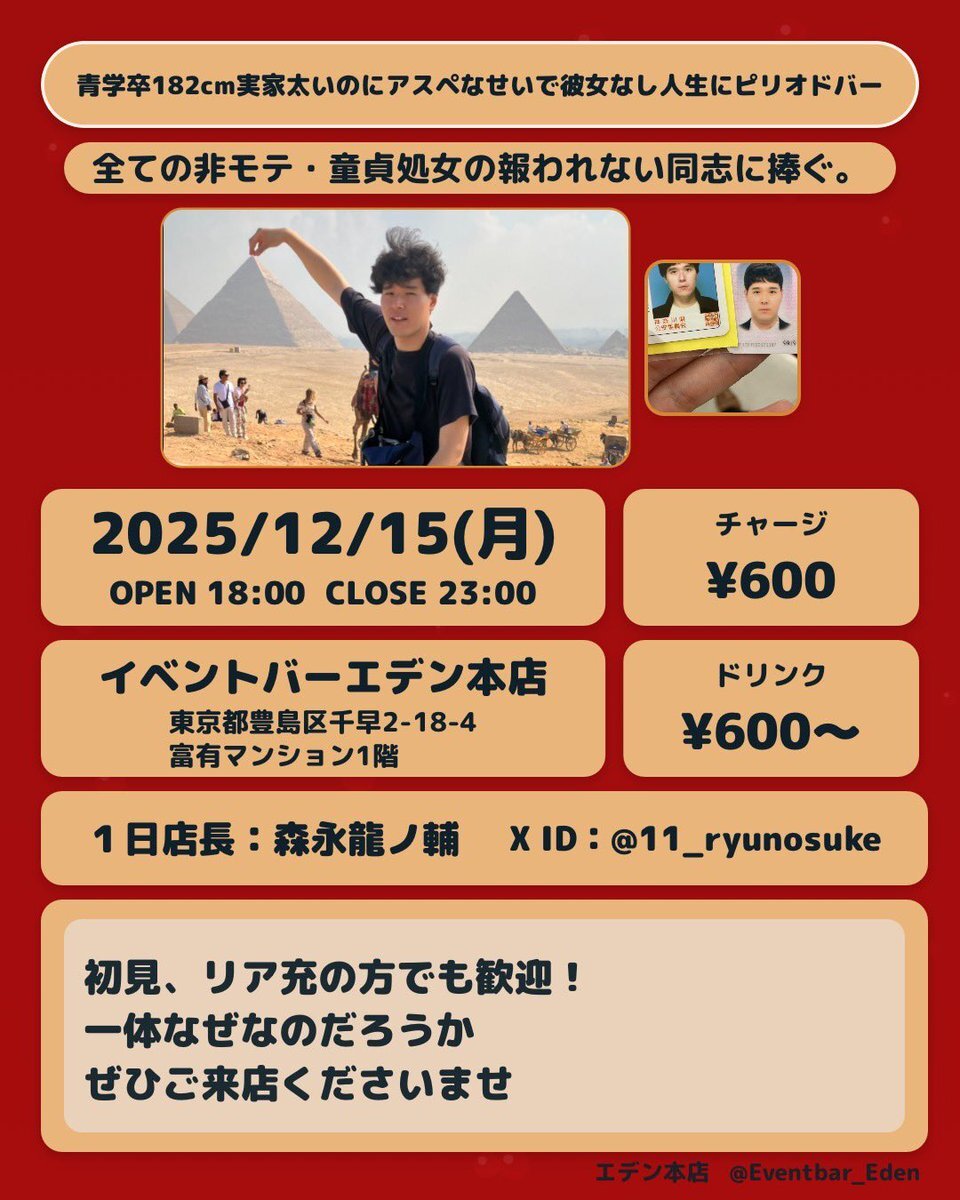 @Eventbar_Eden おはこんばんにちは! 明後日15日に一日店長やります 森永龍ノ輔です✨ 牛丼に限界まで紅生姜を盛って そこに七味を散らして なんとか元を取ろうとする 牛丼乞食の方いませんか? ふつうに旨いっすよね! というわけでよろしくお願いします🙇 #拡散希望 #要町 pic.x.com/KIZVIdPGDC