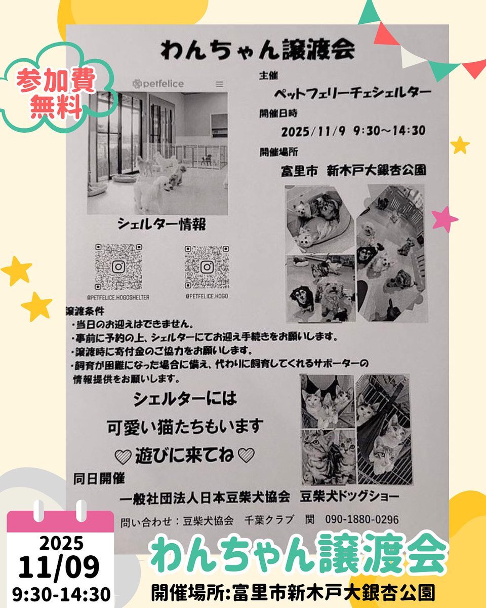 【11/9 千葉県譲渡会開催!】 富里市 新木戸大銀杏公園で 開催いたします🍀 参加無料です🐶🐾 お気軽にお越しください❣️ #里親募集中 #保護犬 #埼玉 #見沼 #petfelice #保護猫 #譲渡会 #千葉 pic.x.com/KD40zHxt8n