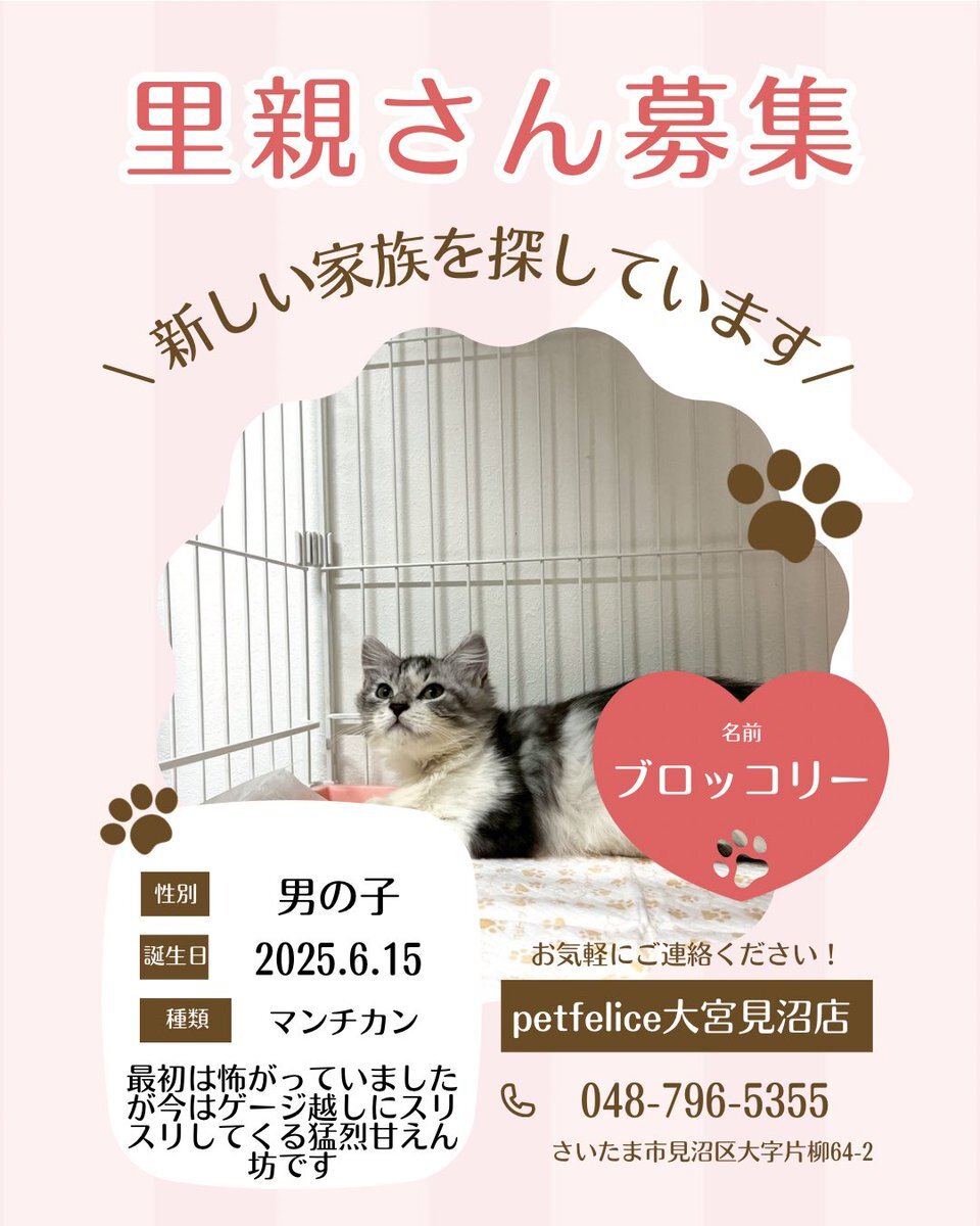 【里親様募集中🐾】 名前.▹ブロッコリー #マンチカン 2025.6.15 男の子 素敵なご縁がありますように(⁎ᴗ͈ˬᴗ͈⁎) ▶petfelice(ペットフェリーチェ) さいたま市見沼区大字片柳64-2 048-796-5355 #里親募集中 #埼玉 #見沼 #petfelice #保護猫 pic.x.com/WAZJemAayg