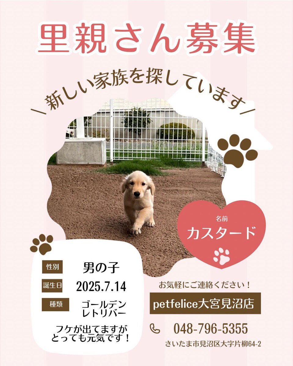 【里親様募集中🐾】 名前.▹カスタード #ゴールデンレトリバー 2025.7.14 男の子 素敵なご縁がありますように(⁎ᴗ͈ˬᴗ͈⁎) 混雑緩和とスムーズなご案内のために ご予約をお願いいたします。 遅れてご来店の場合はお待ちいただくか、 短い時間でのご案内になります。 #見沼 #petfelice pic.x.com/KfcSOs8ilQ