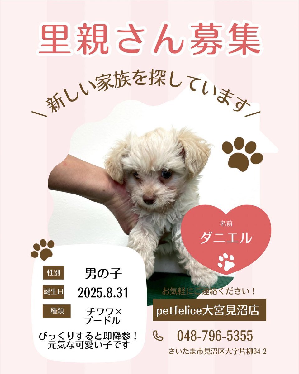 【里親様募集中🐾】 名前.▹ ダニエル #MIX チワワ×プードル 2025.8.31 男の子 素敵なご縁がありますように(⁎ᴗ͈ˬᴗ͈⁎) 混雑緩和とスムーズなご案内のために ご予約をお願いいたします。 見沼店から与野店へ店舗移動の可能性があります。 #見沼 #petfelice pic.x.com/Wz5LXntyqQ