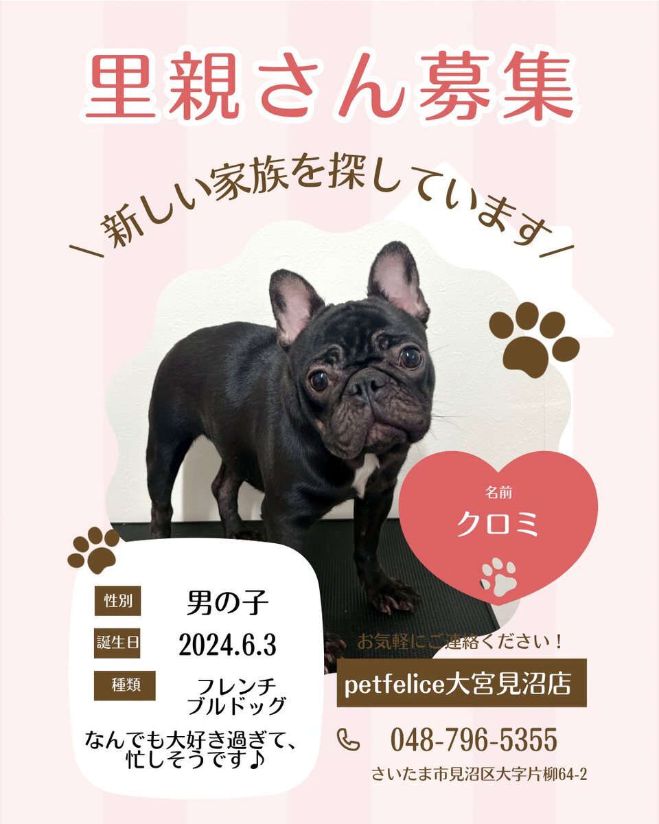 【里親様募集中🐾】 名前.▹ クロミ #フレンチブルドッグ 2024.6.3 男の子 素敵なご縁がありますように(⁎ᴗ͈ˬᴗ͈⁎) 混雑緩和とスムーズなご案内のために ご予約をお願いいたします。 見沼店から与野店へ店舗移動の可能性があります。 #里親募集中 #保護犬 #埼玉 #見沼 #petfelice pic.x.com/1gCbLOGqWz