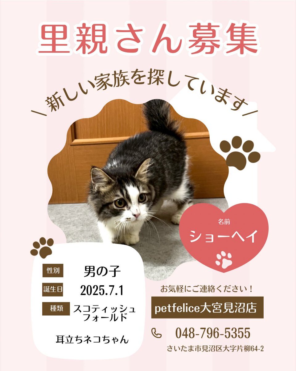 【里親様募集中🐾】 名前.▹ショーヘイ #スコティッシュフォールド 2025.7.1 男の子 素敵なご縁がありますように(⁎ᴗ͈ˬᴗ͈⁎) ▶petfelice(ペットフェリーチェ) さいたま市見沼区大字片柳64-2 048-796-5355 #里親募集中 #保護犬 #埼玉 #見沼 #petfelice #保護猫 pic.x.com/wONtVYWZll