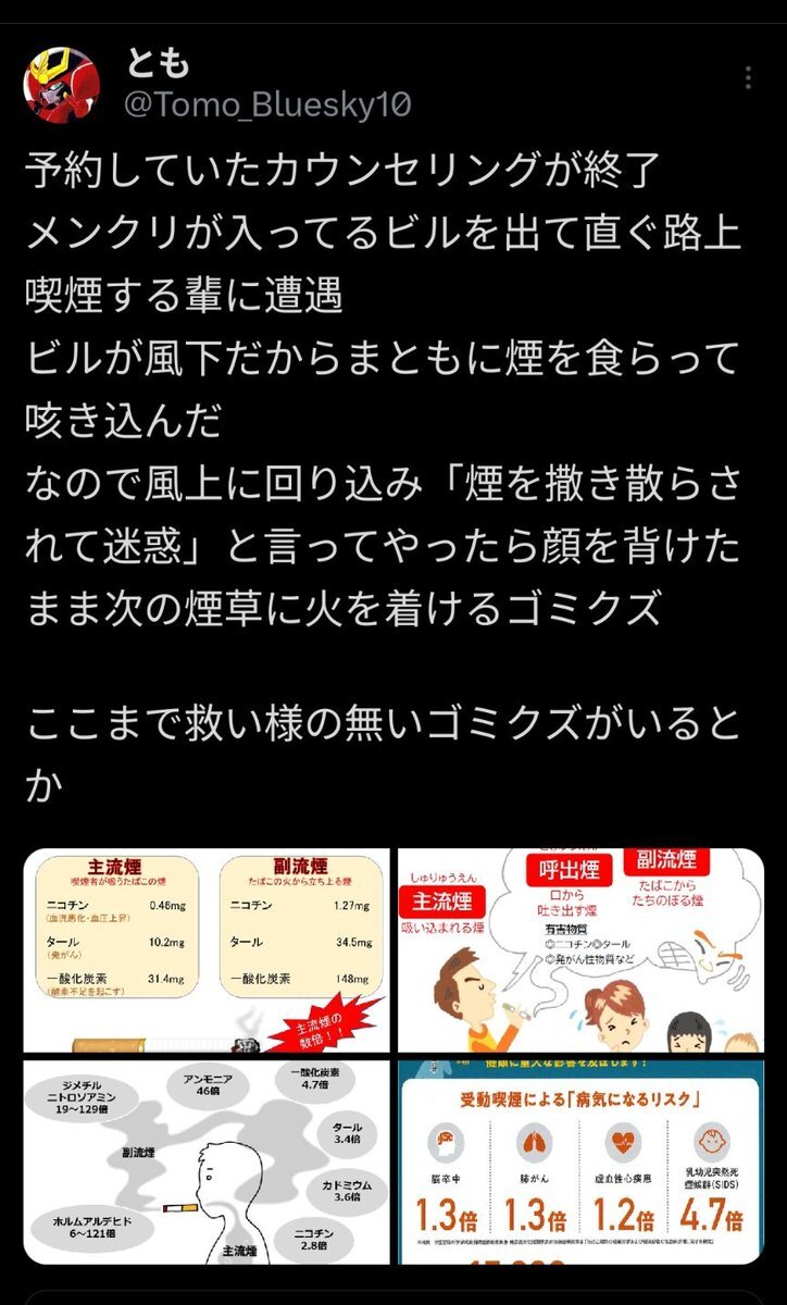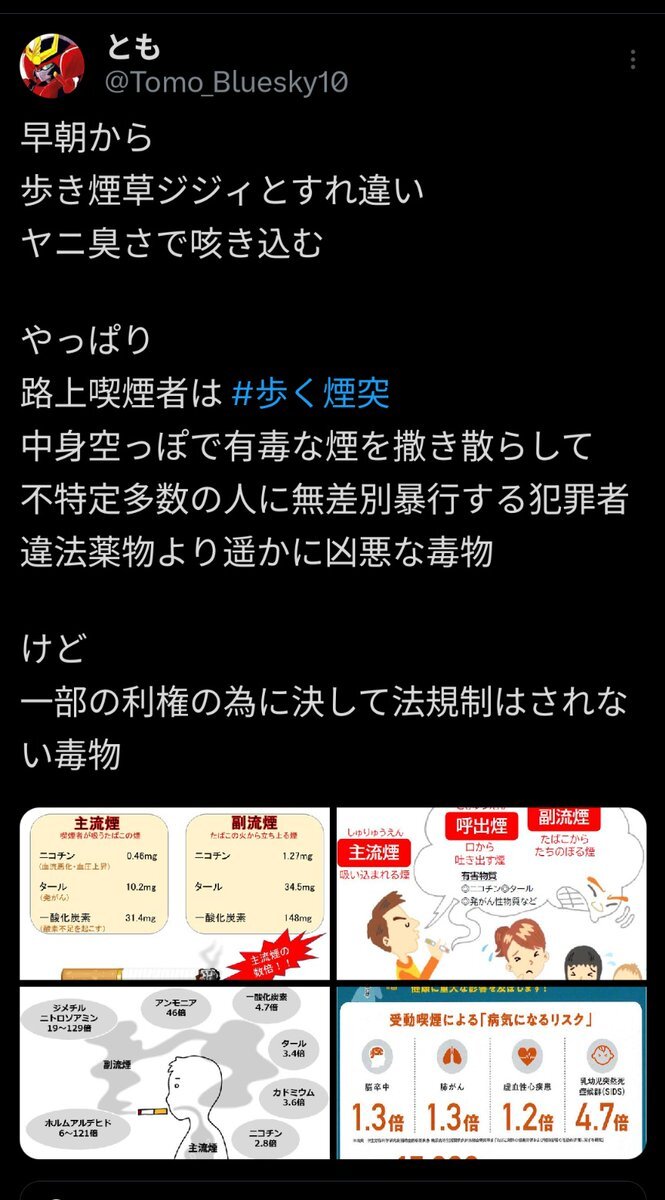 カウンセリングが終わって帰宅 途中で幾度も路上喫煙に出くわしてて毒の煙にやられて激しく咳き込む 1時間ほど経った今でもまだ喉が痛い #喫煙者は犯罪者 周りの迷惑を一切顧みない頭空っぽの #歩く煙突 そもそも #大麻 も #覚醒剤 は違法なのに #煙草 が違法でないのはおかしい pic.x.com/4xJMx1ifjf x.com/Tomo_Bluesky10…