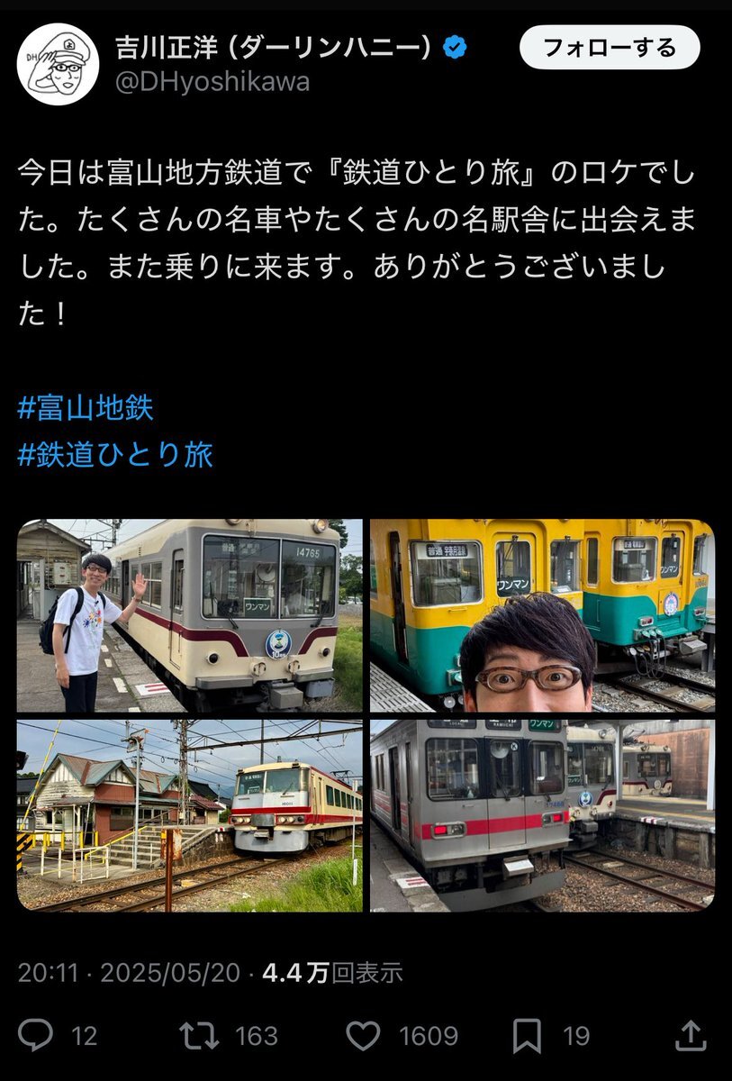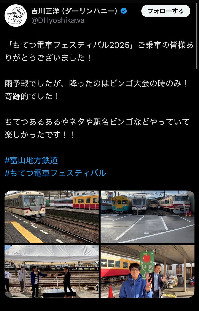 #地鉄 激ゆる百景】26 #ちてつ電車フェスティバル 今年のゲストはこのお二人。吉川さんは数ヶ月前にも番組ロケで訪れたとか。 #地域鉄道 の役割に留まらず、日本全国にファンを持つ地鉄。#富山県 #観光振興 の観点からも、この価値の高さは県下全体で共有したいところ。 #富山地方鉄道 #多面的価値 pic.x.com/DJZBTmYX85 x.com/t_chitetsu_ad/…