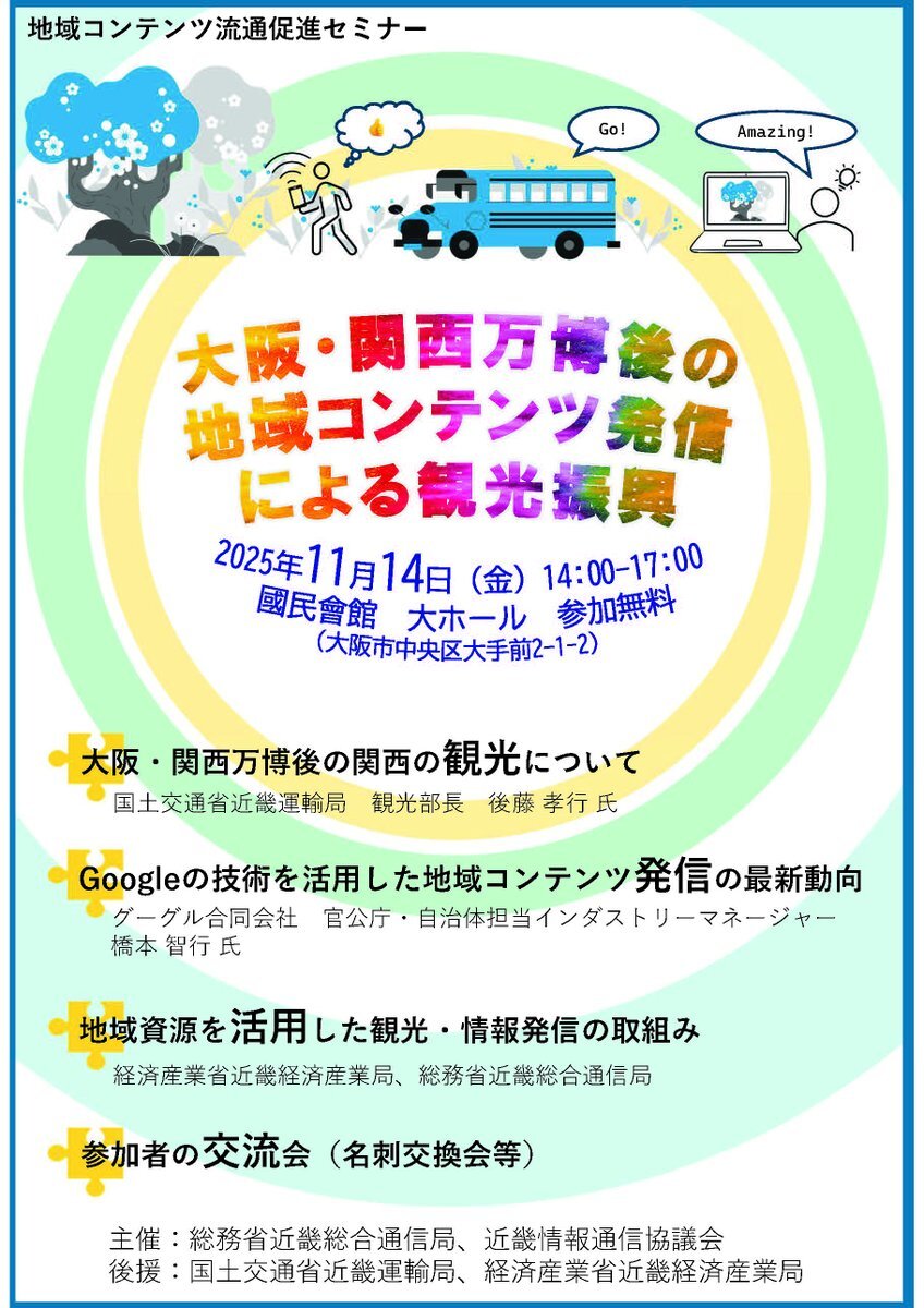 「地域コンテンツ流通促進セミナー」開催 11月14日(金)「大阪・関西万博後の地域コンテンツ発信による観光振興」をテーマに、今後の関西における観光振興やICT技術を活用した地域コンテンツ発信の最新動向に関する講演を行います。 参加者同士の交流会もあります!🛫🧳🏯 soumu.go.jp/soutsu/kinki/0…