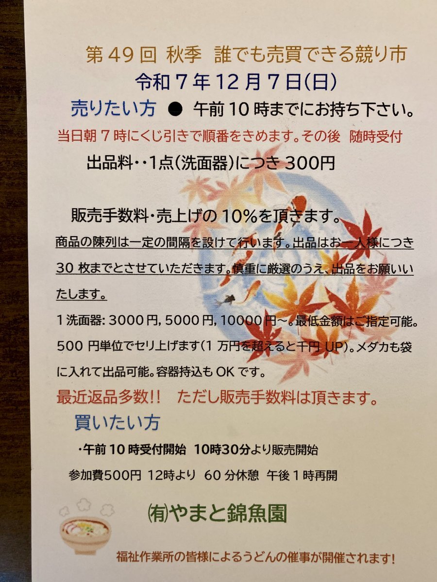 来たる12月7日(日)第49回秋季 誰でも売買できる競市🐟が金魚のふる里 大和郡山市 (有)やまと錦魚園にて開催されます😃 場所 奈良県大和郡山市新木町107 電話 0743-52-3418 (有)やまと錦魚園 #京都 #福知山市 #金魚 #らんちう #金魚屋 #観賞魚 #アクアリウム #奈良県 #大和郡山 #やまと錦魚園 pic.x.com/c34yTxXe0D