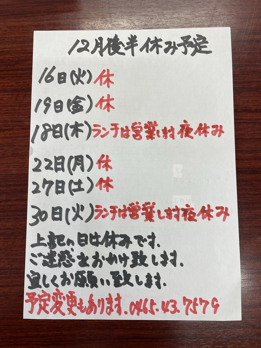 日曜日は3時から‼️(9時まで)😊 今日もお刺身からお肉からお鍋まで色々❗️ 明日12/22は定休なのでぜひ本日ご利用ください〜 よろしくお願いします😽 #居酒屋 #赤星 #牛すじ煮込み #角ハイ #1人飲み #お一人様歓迎 #2人飲み #キンミヤ #仲通り #自称南千住イチチューハイ #自称パーフェクト黒ラベル pic.x.com/umQrNnNUIY