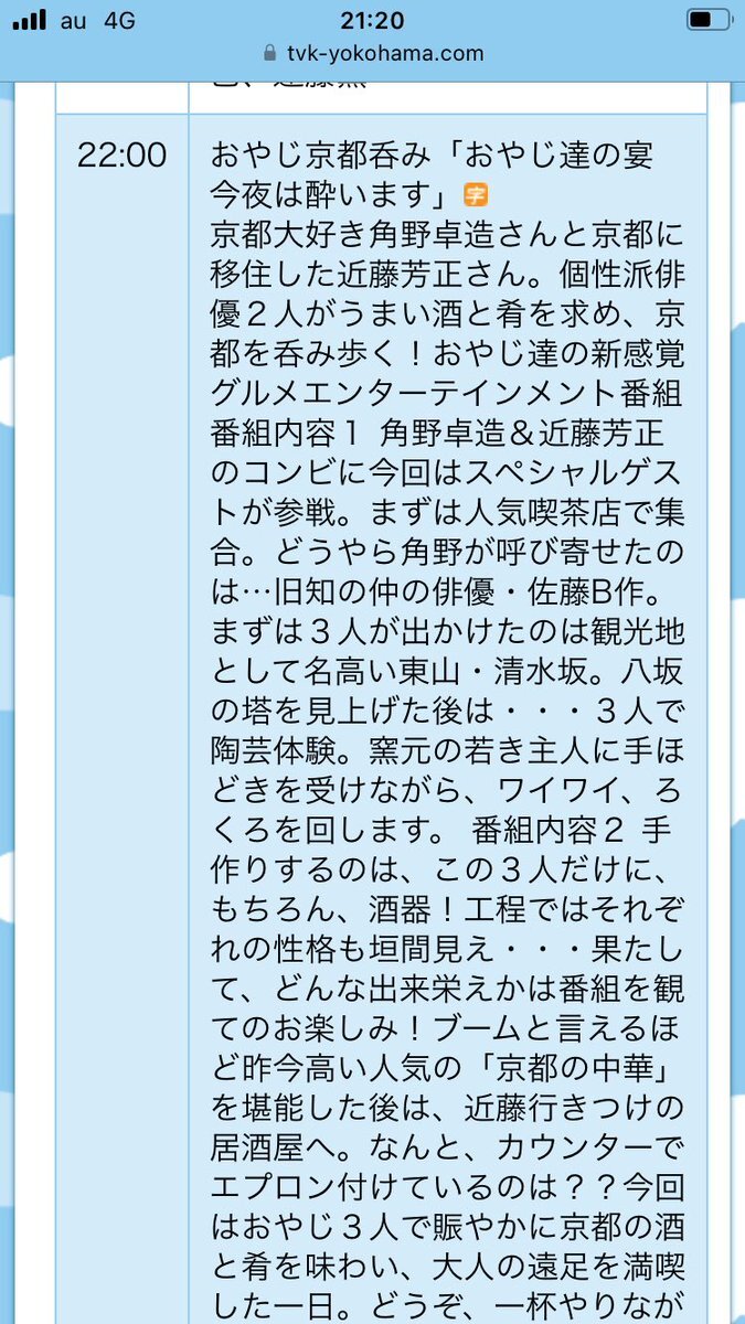 【お知らせ】 本日23日(日)21:30より、BS11にて『#おやじ京都呑み』第21弾が放送されます‼️ この番組は、『#おやじキャンプ飯和歌山編』の共演がきっかけで生まれた #近藤芳正 さんと #角野卓造 さんのグルメ番組です🍻