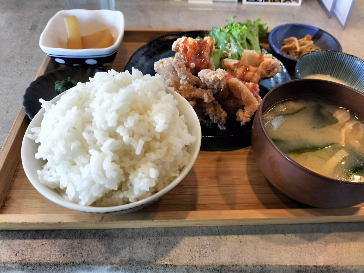 自家製チリソースの唐揚げ定食1200円来ました〜 唐揚げの皮がサクッとしている〜 今日は土曜日なので店内は結構混んでる… #今日の昼食 #今日のランチ #都城市 #都城市上町  #都城市上町のカドの食堂  #カドの食堂 #角野卓造  #自家製チリソース #唐揚げ定食 #唐揚げ pic.x.com/rOJHtk30UF
