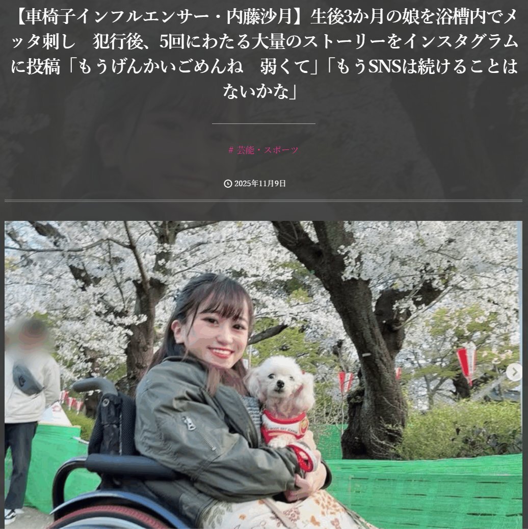 【車椅子インフルエンサー・内藤沙月】生後3か月の娘を浴槽内でメッタ刺し 犯行後、5回にわたる大量のストーリーをインスタグラムに投稿「もうげんかいごめんね 弱くて」「もうSNSは続けることはないかな」 rapt-plusalpha.com/131094/