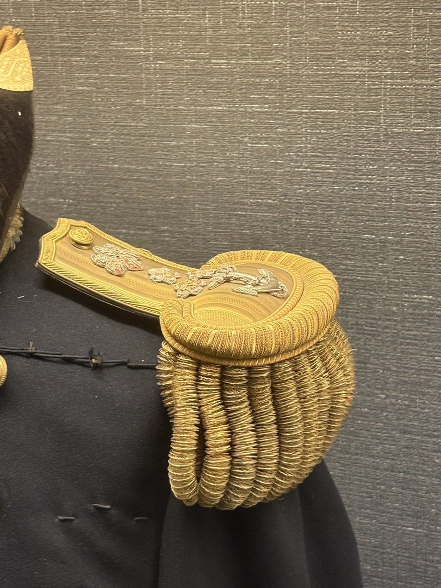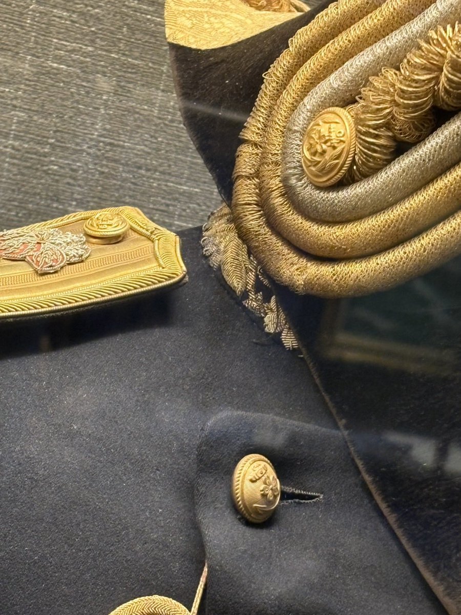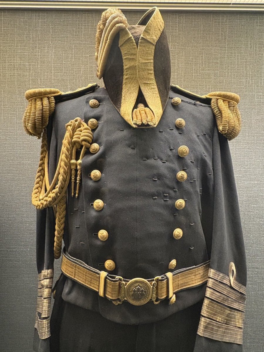 【遺品】記念艦『三笠』の中央展示室にて今も現存している。東郷平八郎 元帥の海軍大礼服...本当に流石は救國の英雄と言うべきか勲章の為のループの数が尋常じゃない。全体的に綺麗に保存されているんだけど「正帽」が乗っかってるせいで...首周りの細かい刺繍を見ることができない。#記念艦三笠 pic.x.com/nhsmCoZZK3
