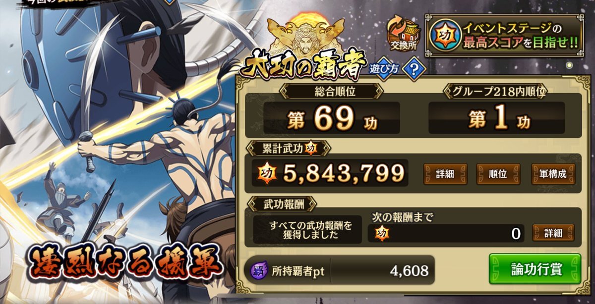 大功の覇者【凄烈なる援軍】 楚国縛りで絶望してたけど、なんとかやれました! しかも過去最高順位😳 二度目の2桁順位🥺うれしぃーー!!目標のSSまでもう少し!! 一緒に頑張ってくれた仲間たちにも感謝♡ #大功の覇者 #記録用 #ポニョーズ取り損ねる pic.x.com/SOFHXbCEUT