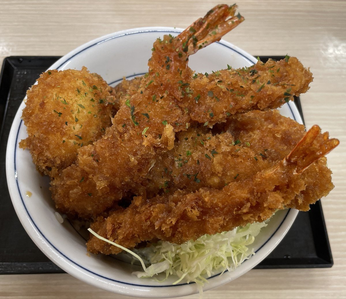 かつや 期間限定 タレカツ丼 エビフライはもちろん、半熟卵のフライがかなり良い仕事してる。 ササミは3本も入ってるので別のフライとかあった方が良かったかも。 #外食記録 #記録用 pic.x.com/OMRCKLK5r4