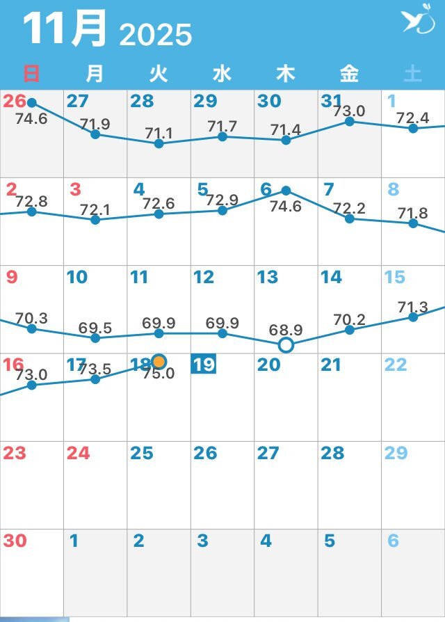 Day51 📊 体重:75.0kg(+1.5kg) 📉 体脂肪率:19.9%(+0.9%) 🔥 MAX:105.0kg 🌙 MIN:68.9kg 現在トータル:−30.0kg 🎯 66kgまで:あと9.0kg 🎯 15%まで:あと4.9% ⏳ リミット(12/25):あと37日 ⸻ #ダイエット #AIトレーナー #減量記録 #ボディメイク #40代ダイエット #記録用 pic.x.com/JE8Bs4s57M